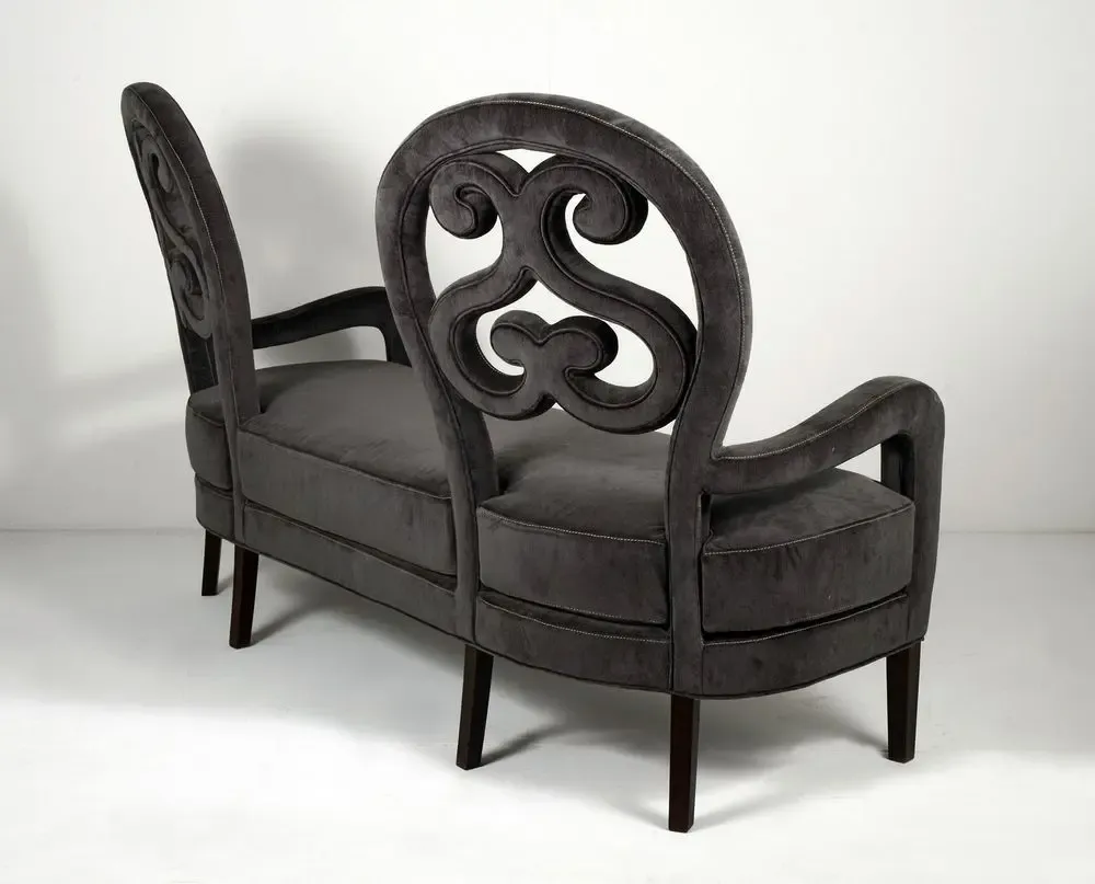 Обивка: Используются натуральные ткани: шелк, сатин, бархат. Обивка может быть однотонной или с едва заметным орнаментом. Часто применяется техника капитоне — глубокая стёжка пуговицами, образующая ромбы или квадраты, придающая мебели объём и роскошь.