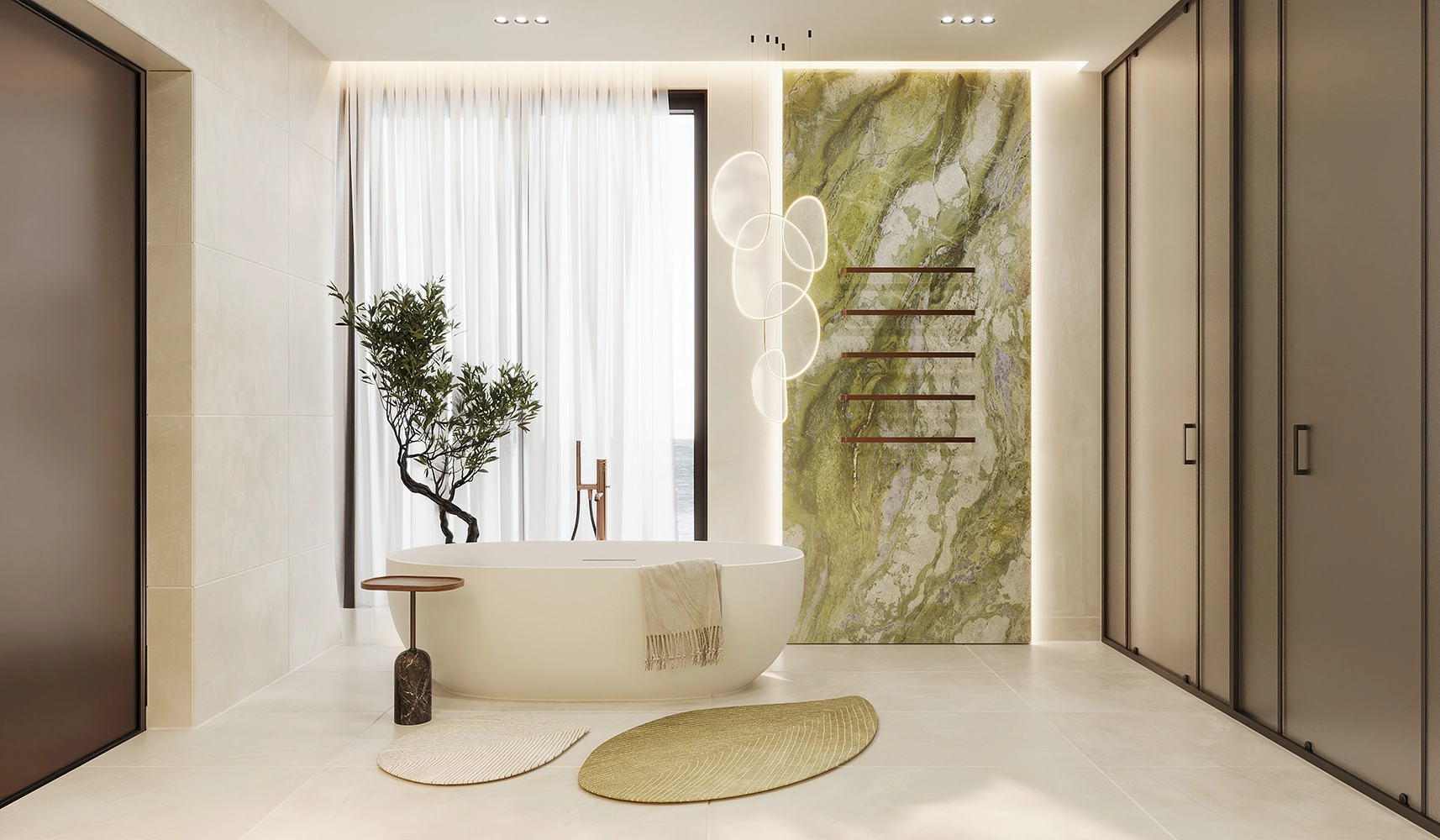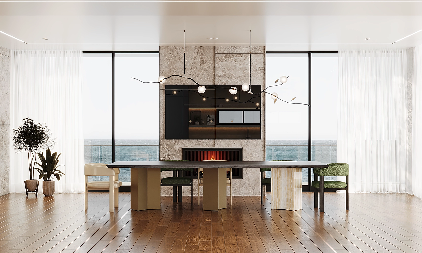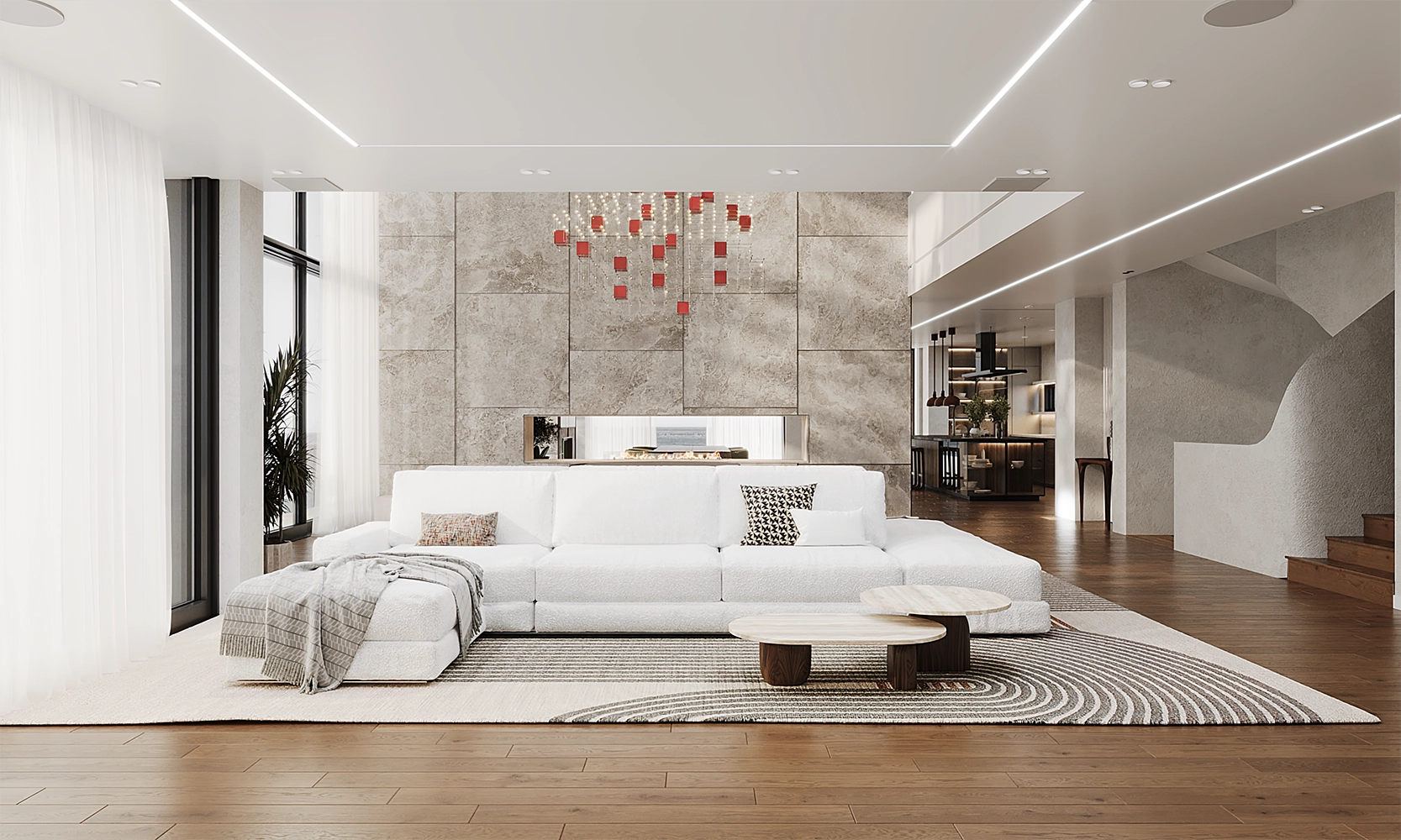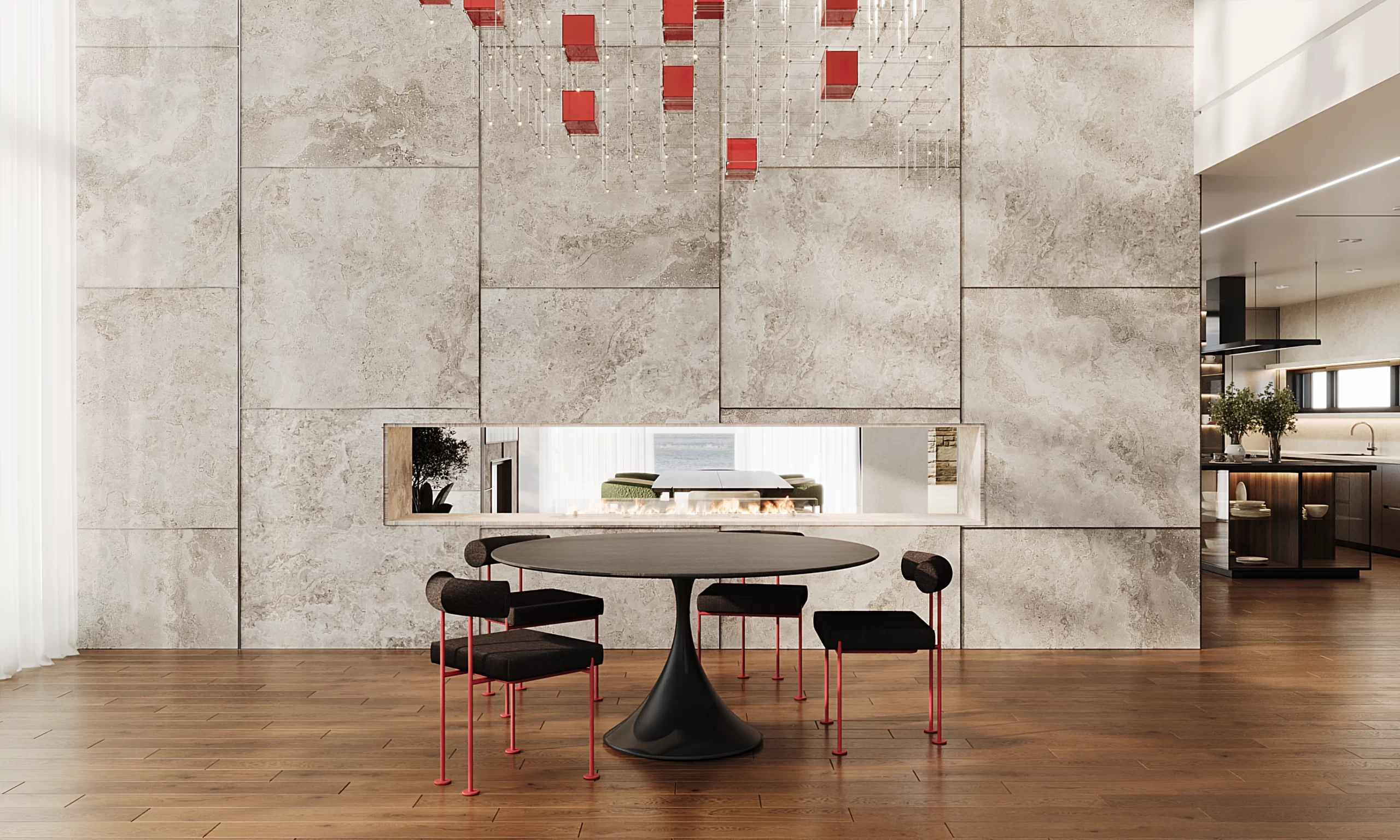Душа дома сосредоточена в двух величественных элементах: архитектурной лестнице, отделанной редким тиком в насыщенных медовых тонах, и захватывающей дух люстре Pollux от Quasar, созданной визионером Яном Паувельсом (Jan Pauwels). Это эфирное созвездие света является небесным сердцем резиденции. Каждая фактура выбрана с непоколебимой верностью идее комфорта, дополненной яркими акцентами, которые привносят жизнь в выверенное пространство. В Mutoyaka Ксения Лазаревика не просто декорировала дом, она создала мир без границ.